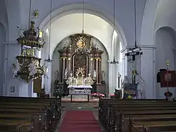 Das Kircheninnere zeigt einen dreijochigen Längszentralraum, das Mitteljoch mit einer Flachkuppel ist querschiffartig durch flache Seitenkapellen erweitert, die Wände zeigen starke Wandpfeiler mit Doppelpilastern und verkröpftem Gesims, darüber Doppelgurte mit Platzlgewölben. Ein schmales Emporenjoch beinhaltet eine Empore mit einer stark vorschwingenden Orgelbrüstung.