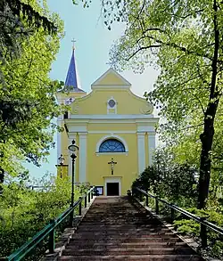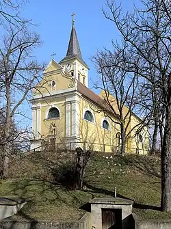 Stilistisch ist der Kirchenbau dem Klassizismus zuzuordnen. Es handelt sich um einen verputzten Ziegelbau, der mit Eckrustika und Stockwerksbändern versehen ist, und eine schlichte spätklassizistische Volutengiebelfassade mit Doppelpilastern und einem großen, zentralen Lunettenfenster besitzt. Im Norden steht ein Sakristeianbau. Der dreigeschoßige Nordturm ist im Kern romanisch und mit Eckquaderung, Doppelschallfenstern und Spitzhelm verziert. Er wurde Mitte des 19. Jahrhunderts erbaut.