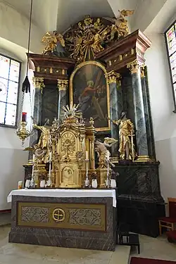 Die Westfront ist mit einem Fassadenturm mit Pilastergliederung und Dreieckgiebel mit der Jahresangabe 1756 ausgestattet. Über der Vorhalle befindet sich der Orgelchor. Das zweijochige Langhaus hat ein Platzlgewölbe und Gurten auf vorschwingenden Mauerpfeilern. Der eingezogene einjochige Chor mit einem Halbkreisschluss hat ein Stichkappengewölbe. Die Sakristei hat eine Empore.