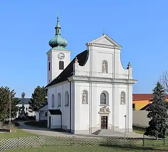 Urkundlich wurde 1200 eine Kirche genannt, eine Vermutung nimmt eine Filiale des Schottenklosters an. 1227 wurde urkundlich der Pfarrer Berthold genannt. Die Kirche besteht aus mehreren bauhistorischen Zeiträumen, der romanische Chorquadratturm ist teils erhalten, ein gotischer Kapellenanbau ist erhalten. Das barocke Langhaus aus 1714/1715 war eine Kirchenerweiterung nach Westen unter dem Patronatsinhaber Bartholomäus I. von Tinti. Um 1900 erhielt der Turm einen Zwiebelhelm mit Laterne und südseitig eine Beichtkapelle. 1995 wurde die Kirche innen, 1998 außen restauriert.