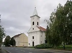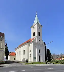 Die frühklassizistische Saalkirche mit Fassadenturm verfügt über einen eingezogenen, dreiseitig geschlossenen Chor im Westen sowie ein eingezogenes Vorjoch mit Giebelfassade und einen leicht vorgezogenen, durch Pilaster gegliederten Turm mit rundbogigen Schallfenstern und Zeltdach im Osten. Südlich des Chors liegt eine eingeschoßige Sakristei.