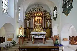 Die Kirche, die in Verbindung mit der Rosalienkapelle eine viel besuchte Wallfahrtsstätte ist, hat einen barocken Hochaltar. In dessen Mittelpunkt steht eine aus dem 15. Jahrhundert stammende gotische Madonna mit auf dem Arm liegenden Jesukind. Der Legende nach ist diese Statue bei Bränden und anderen Zerstörungen immer unversehrt geblieben.[1][2][3]