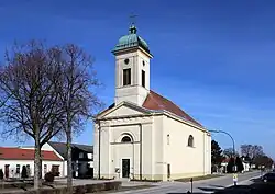 Die Kirche ist ein spätklassizistischer Bau, mit mächtigem Langhaus und dominierender Westfassade. Diese ist durch Pilaster und ein Konsolenfries gegliedert. Darüber befindet sich ein Dreiecksgiebel mit Fassadenturm und Biedermeierhelm. Über dem Westportal befindet sich ein Lünettenfenster.[2]