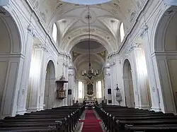 Das mit einer Stichkappe überwölbte Langhaus wird im Westen durch eine eingezogene Konche mit der Empore abgeschlossen. An den Seiten sind zwei rundbogige Kapellennischen mit Quertonnen und im Zwischenjoch gleich hohe Portalnischen. Ein eingezogener Triumphbogen bildet den Übergang zu einer querrechteckigen Vierung mit ovaler Pendentifkuppel, die sich in gleich hohe querarmartige Kapellenannexe mit Platzwölbungen zu beiden Seiten öffnet. Diese Anbauten sind durch Ausbuchtungen in der Breite der Anräume kulissenhaft angebunden.