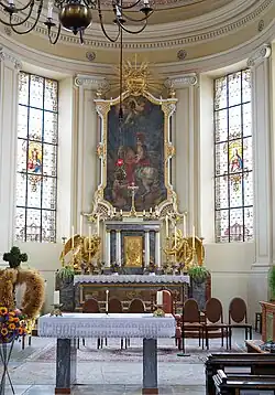 Der Hochaltar hat eine freistehende Mensa mit klassizistischem Säulentabernakel und Adorationsengeln und wurde im Jahre 1784 von Benedikt Henrici geschaffen. Das frei hängende Altarretabel im Chorschluss aus der Mitte des 18. Jahrhunderts zeigt in einem Rokokorahmen ein Bild des heiligen Martin.