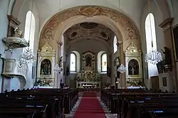 Am Chorgewölbe zeigt Malerei mit spätbarocken Scheinstuckaturen mit Medaillons die Dreifaltigkeit und in den Zwickeln Evangelisten. Die Glasmalerei zeigt im Chor hl. Theresia 1900, Herz Mariä und Herz Jesu 1885, im Langhaus hl. Cäcilia um 1910/1920.
