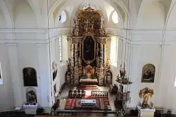 Der Hochaltar mit einem Säulenaufbau und Umgangsportalen zeigt figuralen Schmuck von Josef Schokotnigg 1743 und das Altarbild hl. Leonhard von Joan B. Rannacher 1745. Der Tabernakel entstand um 1780.