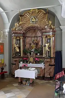 Die Glasmalerei um 1928 zeigen die Heiligen Johannes, Antonius, Jakob, Maria mit Kind, Leopold und Georg, in der Vorhalle Symbole der Kardinaltugenden.