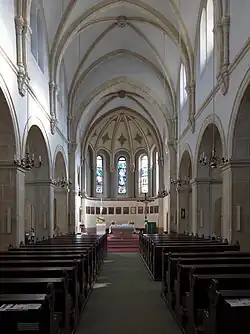 Es gibt einen neugotischen Seitenaltar mit Tabernakel. Der Taufstein und die Kirchenbänke sind aus der Bauzeit.[2]
