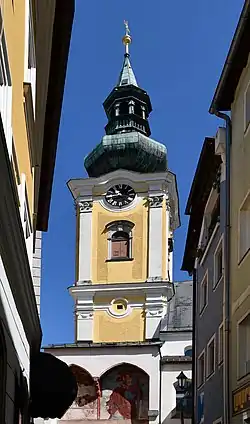 Aus der mittelalterlichen Erbauungszeit sind Reste gotischer Fresken erhalten. An der inneren Nordwand der Turmhalle stammen sie aus der Mitte des 14. Jahrhunderts. Die Darstellungen an der südlichen Kirchenaußenseite zeigen den hl. Christophorus und das Jüngste Gericht. Sie sind spätgotisch (aus der Zeit um 1520/1530) und wurden 1946/1947 entdeckt und freigelegt. In der Barockzeit erhielt die Kirche den Anbau an der Nordseite (heute ist die Sakristei darin untergebracht), Johann Michael Prunner errichtete unter Einbeziehung mittelalterlichen Mauerwerks den Turm mit Zwiebelhelm und Laterne (er ist 51,45 m hoch); zuletzt fügte man 1723 im Westen vor dem Eingang den Vorbau an. Nach Abschluss der Arbeiten wurde die Kirche im selben Jahr durch den Passauer Bischof Graf Joseph Dominikus von Lamberg neu geweiht.