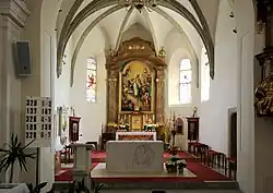 Das Langhaus aus dem 18. Jahrhundert ist stichkappentonnengewölbt und lagert zwischen Doppelgurtbögen. Diese ruhen wiederum auf Doppelpilastern. Im Westen des Kirchenschiffes ist eine dreischiffige kreuzgratunterwölbte Orgelempore. Ein eingezogener rundbogiger Triumphbogen trennt das Langschiff vom einjochigen Chor, der kreuzrippengewölbt ist. Die Schlusssteine sind skulptiert. Eine Skulptur stellt einen Christuskopf, die anderen Rosetten dar. Zwei Konsolsteine weisen Blattdekor auf, die spitzbogige Sakramentsnische ist mit Maßwerk dekoriert. In der Südwand des Chores ist ein Portal mit Schulterbogenportal, das zum kreuzrippengewölbten Turmerdgeschoß führt.