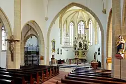 Das Kircheninnere zeigt sich als dreischiffige dreijochige Staffelkirche aus der 2. Hälfte des 15. Jahrhunderts mit einem wesentlich höheren Mittelschiff. Nach dem Brand wurde 1947 anstelle der frühbarocken Wölbung ein Netzgratgewölbe eingebaut, welches auf mächtigen Polygonwandvorlagen und Wappenkonsolen ruht. Die Polygonalpfeiler sind durch Vorlagen kreuzförmig ausgebildet. Die beiden östlichen Joche sind durch weite gekehlte Spitzbogenarkaden zu den Seitenschiffen geöffnet. Im Westjoch ist eine kreuzgratunterwölbte Orgelempore über gedrückten, profilierten Spitzbogenarkaden. Die spätbarocke Brüstung der Empore hat eine Gliederung in Felder und Pilaster. Der Triumphbogen zum Mittelschiff ist spitzbogig und gekehlt. Die schmäleren Seitenschiffe haben längsoblonge Joche und Kreuzgratgewölbe mit reliefierten Schlusssteinen in polygonale Vorlagen übergehend. Im Südschiff an der Westwand ist eine polygonale Wendeltreppe zur Empore mit Rundbogenfenstern. Der Chor aus der 2. Hälfte des 14. Jahrhunderts in Mittelschiffbreite hat zwei kurze Joche und einen 7/12-Schluss und ein Kreuzrippengewölbe mit runden Schlusssteinen in kurze Absenklinge auf Trichterkonsolen übergehend. Beidseitig im Chor sind abgefaste Rechteckportal zur Sakristei und zum Turmerdgeschoß mit einem Kreuzrippengewölbe. Die Sakristei als ehemalige Kapelle hat ein zweijochiges Kreuzrippengewölbe mit Schlusssteinen auf polygonaler Vorlage und an kugelförmiger Konsole anlaufend. Das Gewölbe in der Sakristei zeigt eine spätgotische Rankenmalerei.