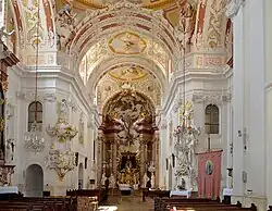 Das Kircheninnere zeigt einen weitläufigen Raum in ausgewogener Zusammensetzung aus einem zentralen überkuppelten Kreuz mit tonnengewölbten kurzen Querarmen und langen Längsarmen und daran angeschlossene Joche mit Hängekuppeln als Eingangs- und Chorjoch andererseits. Im östlichen Joch befindet sich eine platzlunterwölbte Orgelempore mit einer leicht vorschwingenden Brüstung. Der Wandaufbau ist zweizonig mit Monumentalpilastern und einem durchgehenden mehrstufig vorkragenden Hauptgesims. Beim Chorjoch schließt eine halbrunde Apsis an.