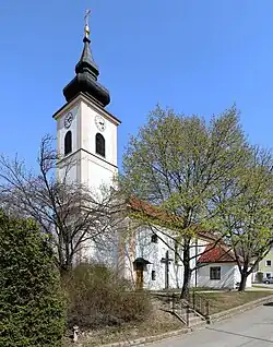 Der spätbarocke Saalbau mit einem Westturm wurde 1801 erbaut.