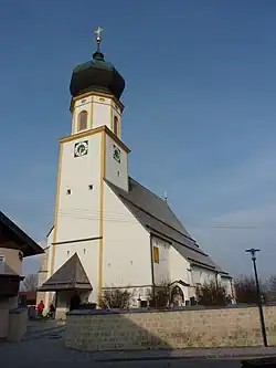 Eine Kirche wurde um 1230 genannt. Die gotische Kirche wurde barockisiert. Ein südliches Seitenschiff wurde am Langhaus angebaut.