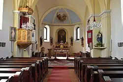Über dem einschiffigen zweijochigen Langhaus befindet sich zwischen Doppelgurtbögen ein breites Platzlgewölbe, das auf Doppelpilastern ruht. Auch über das Chorjoch ist ein Platzlgewölbe gespannt. Ein rundbogiger Triumphbogen trennt das Kirchenschiff vom Chor, über dem sich ein Kappengewölbe befindet. Die einschiffige Empore verfügt über eine vorgebauchte Brüstung.