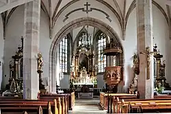 Die Starhemberg’sche Gruftkapelle mit der darunter liegenden Gruft wurde 1499 angebaut und Ende des 16. Jahrhunderts erweitert. Die Kapelle bildete im 16. und 17. Jahrhundert die wichtigste Grablege des Hauses Starhemberg. An den Wänden der Kapelle befinden sich acht Grabplatten, sieben davon aus rotem Marmor:[1]