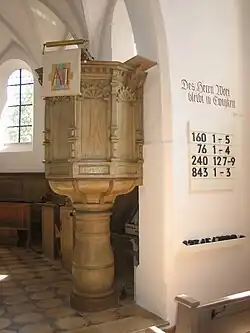 Die Kanzel aus Nadelholz mit Eichenholzeinlagen wurde 1655 eingebaut. Auf dem gebauchten Rundpfeiler ruht der polygonale, durch kannelierte Pilaster mit diamantiertem Sockel und Zahnschnittgesims gegliederte Kanzelkorb. In den Feldern befinden sich Blendbögen. Das Geländer der Kanzeltreppe mit einem eingelegten Sockelfries ist durch Vorlagen und Blendbögen gegliedert. Die Türe zur Kanzeltreppe ist ebenso wie ein Feld des Korbes behandelt.