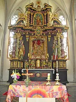 Der Hochaltar wurde im dritten Viertel des 17. Jahrhunderts aufgestellt und in den Jahren 1845, 1898 sowie 1973 restauriert. Die Mittelgruppe des Hochaltars zeigt die Geburt Christi. Eine Engelgruppe sowie die Statuen von Maria und Johannes im Altaraufsatz waren ursprünglich Teil eines spätgotischen Flügelaltars, der von der Werkstatt des Tiroler Bildhauers Hans Klocker geschaffen wurde. Die auf das Jahr 1503 datierten Flügel dieses Flügelaltars befinden sich heute im Diözesanmuseum Graz. Der linke Seitenaltar kann aufgrund einer Kennzeichnung an der Predella in das Jahr 1643 datiert werden. Er zeigt ein Bild der büßenden Maria Magdalena und trägt zwei weibliche Heiligenstatuen, welche Ende des 17. Jahrhunderts gefertigt wurden, sowie eine Statue des heiligen Sebastian, welche ursprünglich zum alten Flügelaltar gehörte. Der rechte Seitenaltar wurde etwas später als der linke Seitenaltar aufgestellt und später auch verändert. Er zeigt ein Bildnis der heiligen Anna, dessen Rahmen aus der Zeit um 1730 stammt. Der polygonale, gotische Taufstein hat eine aus dem Ende des 17. Jahrhunderts stammende Holzbekrönung.