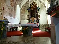 Im Kircheninneren wurden 1956 Fresken vom Meister von Schöder freigelegt. Sie zeigen im Chor am Chorschluss die Bauinschrift 1492 und im Gewölbe Ornamente mit Blüten und Ranken, an der Chornordwand das Jüngste Gericht, daneben durch einen Fensterausbruch großteils zerstört die Kreuzigung Christi, in der Chorschräge Christus am Ölberg. Die Fresken im Langhausgewölbe zeigen Ranken und zwei Medaillons Bartholomäus und Katharina und an der Westwand die Jahresangabe 1497.