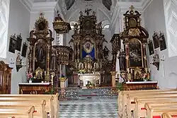 Der Hochaltar mit Säulen und Gebälkstücken und einem gesprengten geschweiften Giebel mit Engelsfiguren und einem Aufsatz mit Putti und hl. Michael mit der Seelenwaage, Engel und hl. Michael schuf der Bildhauer Franz Rasner 1662, das Hochaltarbild Mariahilf ist aufziehbar und hat dahinter eine Monstranz im Strahlenkranz mit Gnadenbild als kleine tönerne Mariahilf-Figur. Im Aufsatz zeigt der Hochaltar die Verehrung des Namens Maria und die seitlichen Figuren Joachim und Anna.