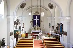 Der Hochaltar mit einem freistehenden Rokokotabernakel zeigt an der Wand ein großes Altarbild Anna mit Maria in einem geschweiften Rahmen mit Zopfdekor. Die Orgel aus 1794 mit 8 Registern wurde von Johann Gottfried Malleck gefertigt.