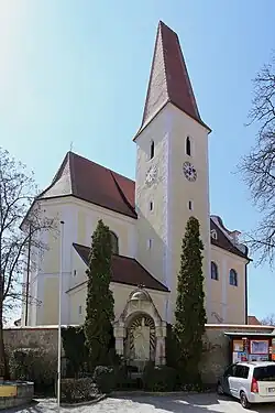 Die im Kern mittelalterliche Kirche wurde nach 1742 barock neu erbaut, zwischen Turm und Hauptportal ist lagiges Quadermauerwerk aus dem 12. Jahrhundert erhalten, der nördliche Chorteil ist spätmittelalterlich mit Ortsteinen wohl aus dem 15. Jahrhundert, der vorgestellte Nordturm ist spätgotisch.