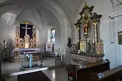 Das Kirchenschiff besteht aus vier Jochen, die platzlgewölbt sind. Dazwischen sind Gurtbögen, die auf flachen Pilastern ruhen. Die Kirche ist im Inneren zart mit Stuck dekoriert. Die Empore wurde aus Holz errichtet. Der Triumphbogen, der das Kirchenschiff vom Chor trennt, ist rundbogig. Über der Apsis ist Schalengewölbe mit Stichkappen.