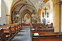 Das Kircheninnere zeigt ein vierjochiges Langhaus mit einem Kreuzrippengewölbe auf schmalen vorgelegten Pfeilerdiensten und Konsolen, die Rippen wurden im östlichen Bereich teilweise abgeschlagen. Der schmale spitzbogige Triumphbogen ist aus der Achse gerückt. Westlich steht eine gemauerte barocke Sängerempore auf eckigen Pfeilern. Im Chor gibt es eine Sakramentsnische mit einem gotischen Rosettengitter.