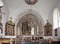 Das Kircheninnere zeigt sich als dreijochiges Langhaus mit Schwibbögen und Flachgewölben wegen einer anfänglichen Flachdecke. Das westliche Joch ist eine barocke Erweiterung. Die hölzerne Orgelempore über zwei Säulen aus 1852 nimmt die westliche Hälfte des Saalraumes ein. Das Langhaus hat neben spitzbogigen auch barocke rundbogige Fenster.