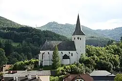 Die Kirche am Eingang des Laabachtales und in erhöhter Lage ist eine ehemalige Wehrkirche. Sie ist teilweise von einer Wehrmauer umgeben und wurde in mehreren mittelalterlichen Bauetappen errichtet. Das dreijochige gotische Langhaus mit dem Kreuzrippengewölbe sowie die Apsis sind um 1400 erbaut worden.[4][5][6] Der langhausbreite Chor hat eine Achsabweichung zum Langhaus und einen 5/8-Schluss.