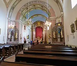 Die Seitenaltäre um 1800 haben marmorierte Wandverkleidungen um eine Mittelnische und tragen seitlich hochbarocke Statuen, links die Heiligen Johannes Evangelist und Matthäus und rechts Markus und Lukas, alle um 1700.