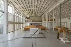 Der Kirchenbau mit einem offenen großzügigen Saalraum zeigt auch mit großer Außenwirkung. Der luftige Glockenturm auf vier Stehern hat verbretterte Schallöffnungen im Glockengeschoß.