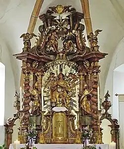 Der Hochaltar, ein kleinerer Opfergangsaltar mit lockerer Säulenarchitektur, ist am Antependium mit 1746 bezeichnet. Die Mittelfigur stellt den Kirchenheiligen St. Veit dar.