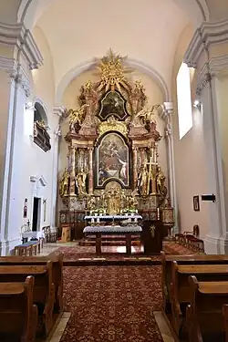 Der Hochaltar mit konkaver Wand und einem Gebälk über zwei Säulen hat einen reich gegliederten Aufbau mit Engeln und dem Auge Gottes und zeigt das Altarbild Mariä Himmelfahrt des Malers Stephan Schaller (1757), das Aufsatzbild Hl. Georg, und trägt die Figuren Stephan und Ladislaus, Benedikt und Bernhard. Der Tabernakel ist aufwendig im Stil des Rokoko gestaltet.