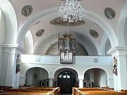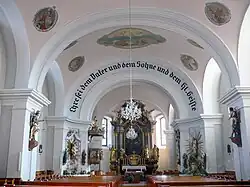 Das Kircheninnere zeigt sich mit spätbarockem Raumcharakter, im Langhaus mit weiten Platzlgewölben auf Wandpfeilern mit sphärischen Einziehungen zum Triumphbogen und zur Westwand. Die dreiachsige Westempore auf Pfeilern ist platzlunterwölbt. Der platzlgewölbte Chor hat innen einen runden Schluss. Die Vorhalle im Turm ist platzlgewölbt.