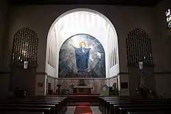 Die von 1954 bis 1959[1] von Architekt Julius Bergmann (1896–1969, aus Perchtoldsdorf) errichtete Pfarrkirche hl. Maria Königin des Weltalls (hl. Severin, hl. Theresia vom Kinde Jesu) ist ein kubisch geschlossener Bau über rechteckigem Grundriss mit eingezogenem, quadratischem, durchfenstertem Chor. Ihre in Naturstein ausgeführte Fassade ist in der Mitte turmartig überhöht und übergiebelt. Die dreibogig geöffneten Vorhalle verfügt über vier, aus farbigem Stein gefertigte und mit „H.Bauch 1964“ bezeichnete Mosaike mit den Evangelistensymbolen. Dahinter liegt ein weiter Saalraum mit Balkendecke, der durch Nischen und Blendbögen gegliedert ist. Darin befindet sich unter anderem eine hallenartige, pfeilergestützte Orgelempore. Auf dem Mosaik an der Chorwand ist die hl. Maria als Königin des Weltalls dargestellt. Die Fenster der Kirche sind aus Buntglas angefertigt.