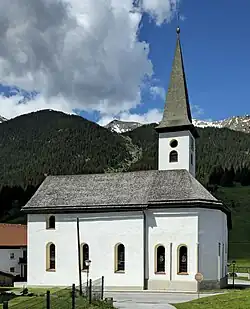 Der Dreiachtelschluss des Chors hat vier abgedachte Dreieckslisenen aus dem Ende des 15. Jahrhunderts. Nordseitig steht ein einfacher Turm mit einem neuen Spitzhelm aus 1978. An der Fassade befindet sich eine Darstellung des Lawinenunglück 1689 gemalt von Ernst Grießer.