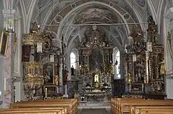 Der Hochaltar stammt aus dem Jahr 1800. Das Altarblatt von Anton Franz Altmutter zeigt die Glorie der heiligen Katharina. Das linke Altarblatt stellt die Himmelfahrt Mariens von Johann Wörle gemalt und stammt aus dem Jahr 1767. Das rechte Altarblatt zeigt den heiligen Johann Nepomuk, gemalt von Josef Arnold im Jahr 1855. Die Figuren hl. Oswald, hl. Florian und zwei weibliche Heilige sowie im Auszug die Hl. Dreifaltigkeit stammen vom Bildhauer Franz Auer aus der Mitte des 19. Jahrhunderts. Der Apostelaltar im Langhaus wurde vom Tischler Kassian Götsch aus dem Jahre 1680 hergestellt und besteht aus drei Retabelgeschossen. Josef Witwer hatte die Figuren geschnitzt, das Altarbild Madonna zwischen Petrus und Paulus stammt vom Maler Josef Thenig.