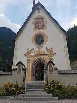 - In der Westfassade befindet sich ein Fresko mit den Heiligen Ursula, Katharina und Barbara von Josef Anton Puellacher aus dem Ende des 18. Jahrhunderts.
