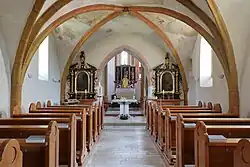 Im Langhaus ruht ein niedriges Kreuzrippengewölbe aus der zweiten Hälfte des 15. Jahrhunderts auf runden Wandvorlagen. Die reliefierten Schlusssteine geben das Lamm Gottes und die segnende Hand wieder. Ein spitzbogiger Triumphbogen verbindet das Langhaus mit dem Chorturmquadrat. Im romanischen Chorturmquadrat wurde Ende des 15. Jahrhunderts ein älteres gotisches Gewölbe durch ein spätgotisches Sternrippengewölbe ersetzt und in der Höhe der gleichzeitig entstandenen östlichen Chorerweiterung angepasst. In der einjochigen Chorerweiterung mit Fünfachtelschluss und drei spätgotischen zweibahnigen Maßwerksfenstern erhebt sich ein Netzrippengewölbe über Runddienste. Die quadratische Südkapelle und deren Apsis sind kreuzrippengewölbt und durch eine spitzbogige Arkade zum Turmjoch hin geöffnet. Ein gotisches Portal mit Eisenplattentür führt in die Sakristei.