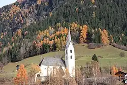 Die Kirche ist ein mittelgroßer, spätgotischer Bau. Sie wurde 1516 errichtet und besteht aus einem Langhaus mit zweifach abgetreppten Strebepfeilern und einem Chor mit Fünfachtelschluss. Der Südturm hat Spitzbogenfenster und wird von einem Spitzgiebelhelm bekrönt. Eine Glocke wurde 1710 von Georg Grassmayr gegossen. Die Vorhalle mit seitlichen Bogenöffnungen ist mit der Friedhofsmauer verbunden. Das Westportal mit einem Spitzbogengewände und einer Rundbogenöffnung aus Serpentin hat eine Rundstabrahmung, ist mit der Jahreszahl 1516 datiert und mit einem Wappen, einem Weihekreuz und einer Leonhardikette versehen. Das Wandgemälde des heiligen Leonhard in einer Landschaft rechts neben dem Portal stammt aus der Mitte des 19. Jahrhunderts.