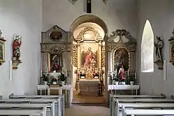 Eine aus Quadern gemauerte gotische Steinmensa mit einem Reliquienfach wurde 1997 abgetragen und weiter westlich in veränderten Dimensionen wieder aufgebaut. Dahinter steht der barocke Hochaltar als hochbarockes Rahmenretabel aus dem Anfang des 18. Jahrhunderts. Das Hochaltarblatt Johannes der Täufer malte Franz Josef Dobiaschofsky (1848). Das Oberbild, den Heiligen Geist darstellend, stammt aus der ersten Hälfte des 18. Jahrhunderts.