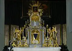 Der Hochaltar besteht aus einem hohen Retabel mit Strahlenkranzaufsatz und kannelierten Pilastern. Das Altarblatt zeigt das Martyrium des heiligen Veit und stammt aus dem Ende des 18. Jahrhunderts.[1] Der reiche Tabernakelaufbau wird von Engelsfiguren flankiert.