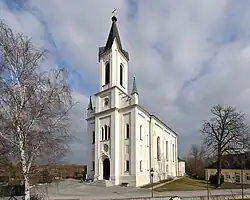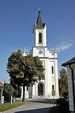 Der streng gegliederte Bau mit neoromanischen Fassadenelementen hat eine hochgezogene, dreigeschoßige Westturmfassade, ein mächtiges Satteldach, hohe Rundbogenfenster innerhalb einer Bändergliederung, ein Rundbogenfries in der Gesimszone und einen wenig eingezogenen Chor. Der Turm wird von einem hohen Spitzhelm bekrönt.