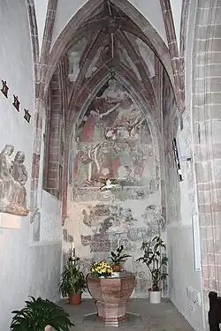 An der Nordwand des Seitenschiffes sind mehrere mittelalterliche und frühneuzeitliche Grabsteine aufgestellt, sie sind dem Geistlichen Heinrich († 1367), Sigismund von Niedertor († 1412), Georg Schenk († 1432), Georg Hafner († 1630) und Anna Barbara Burger († 1691) gewidmet.