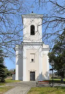 Dem Langhaus mit dem eingezogenen Chor mit einem Dreiseitschluss wurde der Turm vorgestellt. Die Fassade ist einheitlich mit Faschen und Feldern gegliedert. Das Volutengiebelportal am Turm zeigt Ornamente und Beschläge im Stil des Rokoko und die Jahresangabe 1764. Der Aufsatz des Turmes zwischen Volutenanläufen mit Eckpilastern und rundbogigen Schallfenstern trägt ein Pyramidendach. Die Sakristei ist angebaut.