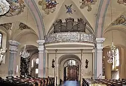 Die Kirche wurde als dreischiffiger gotischer Bau errichtet. Im dritten Viertel des 18. Jahrhunderts im Stil des Barock umgebaut, wurde die Anlage bei der Restaurierung „umgedreht“, so dass das neue Presbyterium gegen Westen gerichtet ist und sich im alten Chor nun der Eingang befindet.