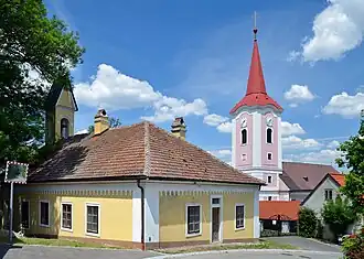 Der einheitliche Neubau entstand 1616/1617 entstand im Auftrag des Protestanten Quintin von Althann. Nach einer teilweisen Zerstörung 1683 erhielt die Kirche von 1712 bis 1724 eine Neuausstattung durch Gundacker von Althann nach den Plänen des Architekten Antonio Beduzzi. 1725 erfolgte die Weihe der Altäre und der Loretokapelle. 1810 wurde der obere Bereich des Chorturmes abgetragen. 1816 erfolgte der Neubau des vorgestellten Westturmes. Die Kirche wurde 1884 renoviert und 1975 restauriert.