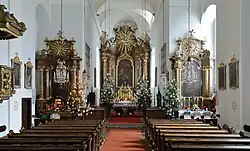 Das Langhaus bildet einen hohen vierjochigen Saalraum mit seitlichen Nischen und trägt ein Stichkappengewölbe auf Pilastern und gekröpftem Gebälk. Im Süden erhebt sich die Mitte der ersten Hälfte des 18. Jahrhunderts errichtete, in der Mitte vorschwingende dreibogige Orgelempore.